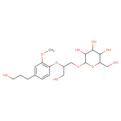 | CHEM033564 | 2-[4-(3-Hydroxypropyl)-2-methoxyphenoxy]-1,3-propanediol 1-glucoside 68340-35-2 | C19H30O10 418.436 |