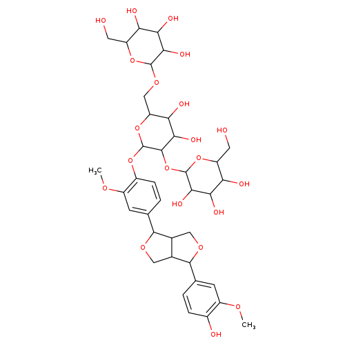 | CHEM033822 | (+)-Pinoresinol 4-O-[beta-D-Glucopyranosyl-(1->2)-[beta-D-glucopyranosyl-(1->6)]-beta-D-glucopyranoside] 150035-90-8 | C38H52O21 844.807 |