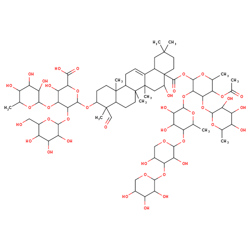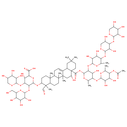 | CHEM030014 | Quillaic acid 3-[galactosyl-(1->2)-[xylosyl-(1->3)]-glucuronoside] 28-[xylosyl-(1->3)-xylosyl-(1->4)-rhamnosyl-(1->2)-[rhamnosyl-(1->3)]-4-acetyl-fucosyl] ester 287386-87-2 | C77H120O41 1701.752 |
