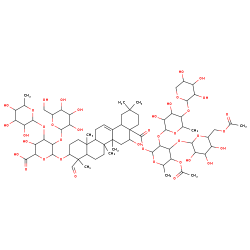 | CHEM022685 | Quillaic acid 3-[galactosyl-(1->2)-[rhamnosyl-(1->3)]-glucuronide] 28-[6-acetyl-glucosyl-(1->3)-[xylosyl-(1->4)-rhamnosyl-(1->2)]-4-acetyl-fucosyl] ester 299184-61-5 | C75H116O39 1641.700 |