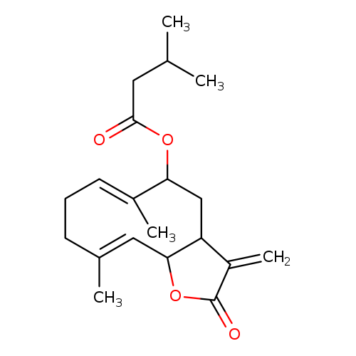 | CHEM025257 | (1(10)E,4E,6a,9b)-9-(3-Methylbutanoyloxy)-1(10),4,11(13)-germacratrien-12,6-olide Not Available | C20H28O4