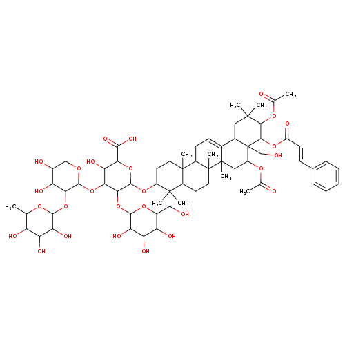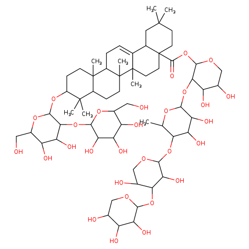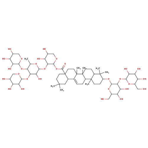 | CHEM027614 | (3b,16a)-Dihydroxy-12-oleanen-28-oic acid 3-glucoside 28-[glucosyl-(1->3)-[xylosyl-(1->3)-xylosyl-(1->4)-rhamnosyl-(1->2)]-arabinosyl] ester 168324-01-4 | C63H102O30 1339.466 |