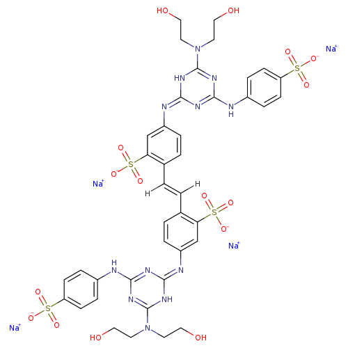 | CHEM044423 | 2,2'-[vinylenebis[(3-sulfo-4,1-phenylene)imino[6-(diethylamino)-1,3,5-triazine-4,2-diyl]imino]]bis(benzene-1,4-disulfonic acid) Not Available | C40H44N12O18S6 1173.220 |
