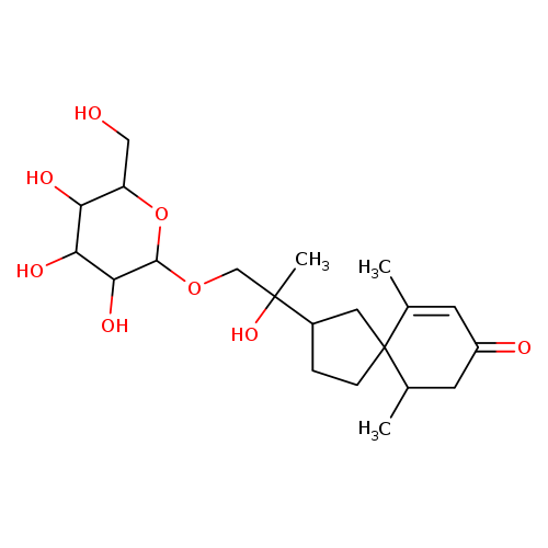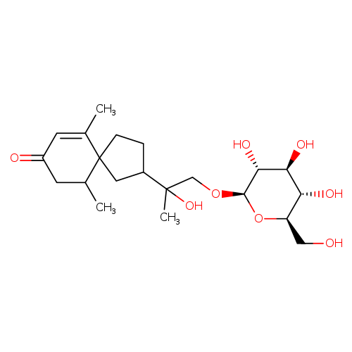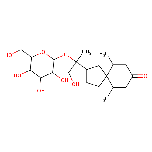 | CHEM026285 | 2-(12-O-beta-D-glucosyl-11-hydroxy-11-methylethyl)-6,10-dimethylspiro[4.5]-dec-6-en-8-one Not Available | C21H34O8 414.490 |