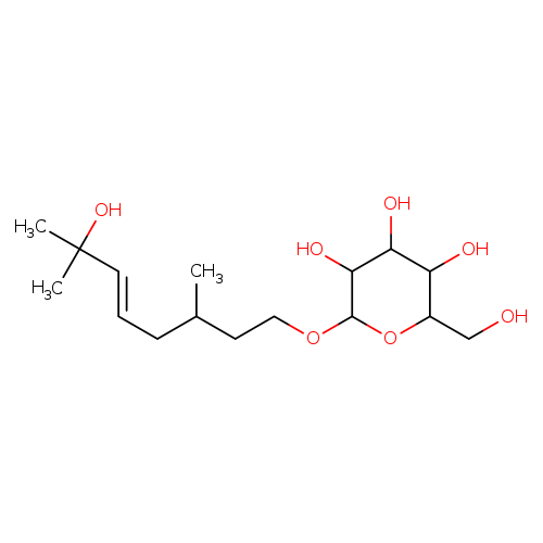 | CHEM028782 | 3,7-Dimethyl-5-octene-1,7-diol 1-glucoside Not Available | C16H30O7 334.405 |
